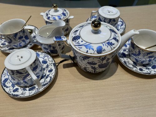 - Für 6 Personen: 1x Teekanne, 6x Tassen, 6x Löffel, 6x Untertassen, 1x Milchkännchen, 1x Zuckerdose